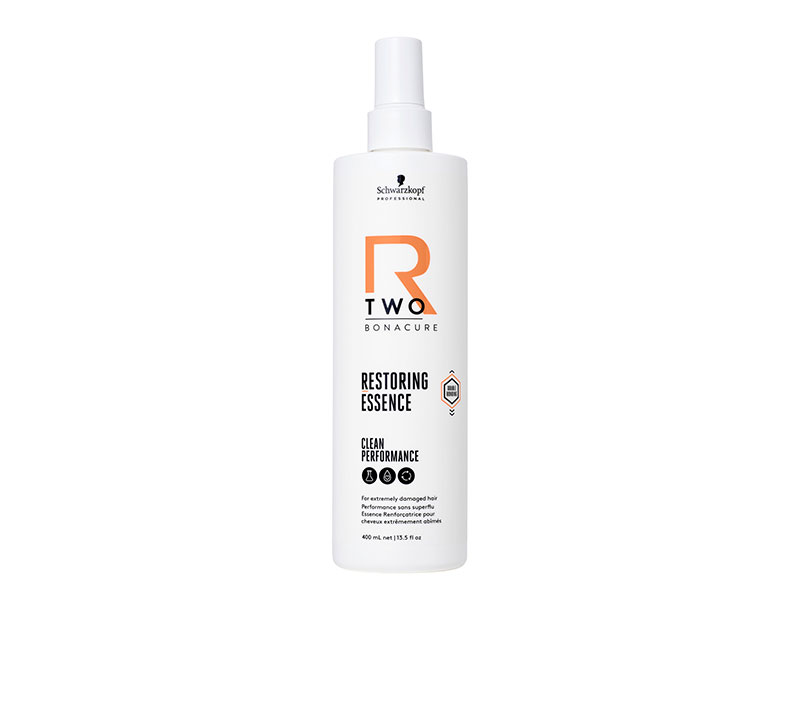 Una Esencia Restauradora instantánea de Bonacure R-TWO que prepara, restaura y fortalece el cabello antes de los servicios de decoloración, aclaración y coloración, así como durante los servicios de cuidado, cuando se utiliza en combinación con el Tratamiento Reparador o el Sellador Renovador.