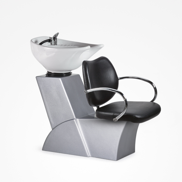 Lavacabezas Perth con pica blanca reclinable de cerámica y grifos monomando italianos. Más sillón Volga tapizado en negro. Garantiza un diseño elegante, un mantenimiento simple y una comodidad sublime.