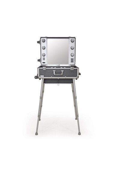 Maletín de maquillaje portátil con ruedas para un cómodo transporte. Dispone de 4 cajones, espejo, 6 bombillas y enchufe. Incluye soporte de 4 patas, pudiéndose colocar también sobre una mesa o superficie plana.También muy práctica para crear un espacio de maquillaje dentro del salón de peluquería.