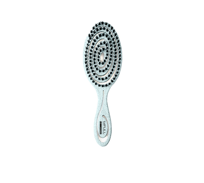 Cepillo biodegradable fabricado a partir de materiales orgánicos, ecológicos y con bajo contenido en carbono. Su diseño curvado con ventilación en espiral permite que el aire pase a través, reduciendo el tiempo de secado. Su doble curva hace que el cepillo se adapte perfectamente al cuero cabelludo y agarre más cabello.