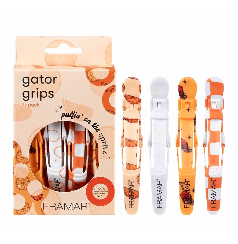 Pinzas profesionales de peluquería “Gator Grips” con diseño exclusivo “Puttin’ on the Spritz” de Framar. Ideales para sujetar secciones de cabello con máxima precisión y seguridad durante cualquier servicio de color o de styling.