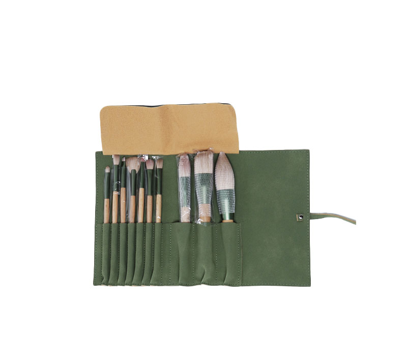 Set de pinceles ecológicos, contiene 10 brochas de maquillaje verdes, con el mango de madera de haya y pelo de nylon. Tienen doble función por la forma de la punta.